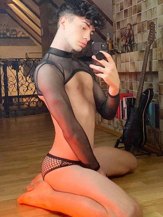 Black Mesh Short Long Sleeve Top Briefs Set