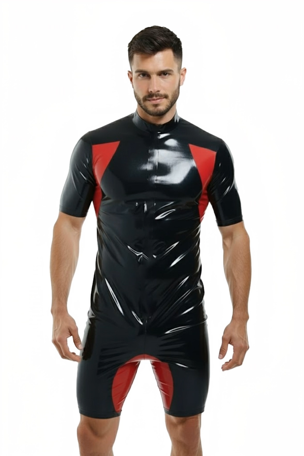 Joylgbt‘s Men’s Stealth-Elite Glossy Bodysuit | Black & Red PU Short Sleeve Leotard