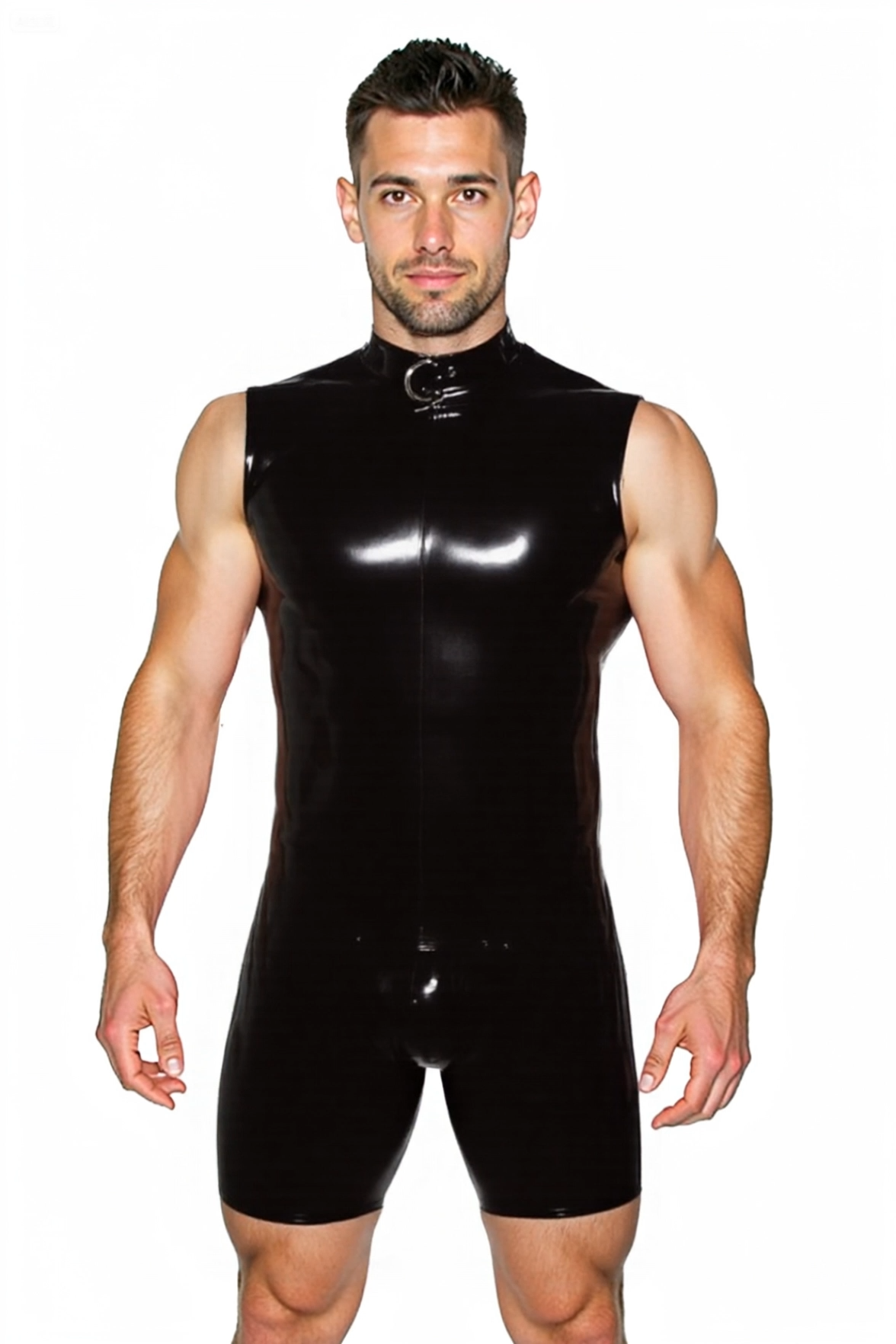 Unleash your wild side with this ultra-sexy men's faux leather romper. Crafted from glossy black PVC-style material, this sleeveless bodysuit hugs your body like a second skin. Featuring a bold O-ring collar detail, full back zipper, and a completely open butt cutout, it's designed to turn heads in the bedroom, club, or on camera. Whether you're into domination, role play, or just flaunting what you’ve got—this piece delivers.