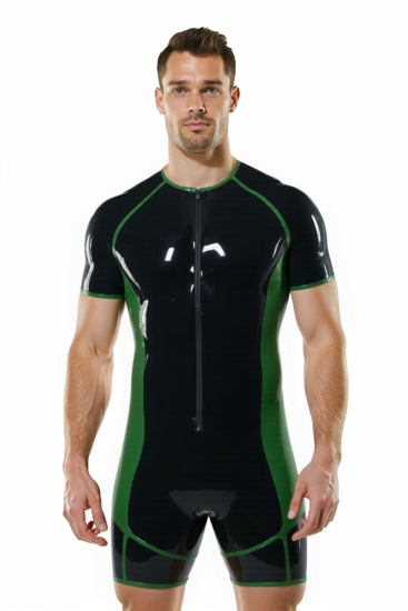 Joylgbt's Men’s Glossy PU Short Sleeve Bodysuit – Black with Red or Green Contrast Trim | Tight Fit Latex-Look Jumpsuit for Clubwear & Roleplay