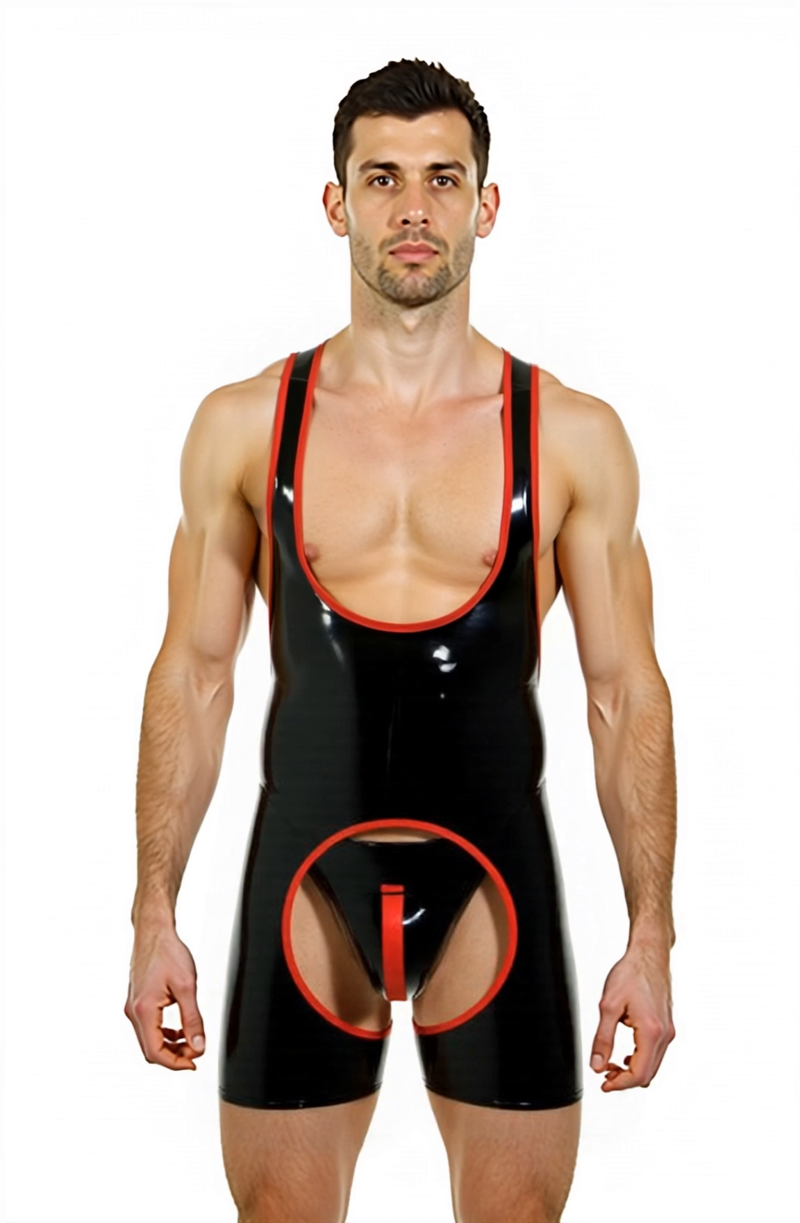 Joylgbt's Men's Black Glossy Leather Bodysuit with Red Trim – Open Front & Back Fetish Romper