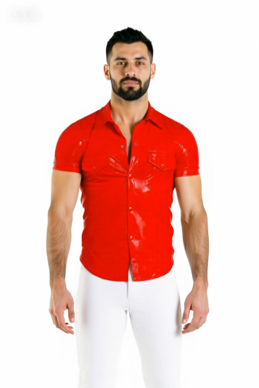 Joylgbt's Short Sleeve Shiny Faux Leather Shirt with Button Front