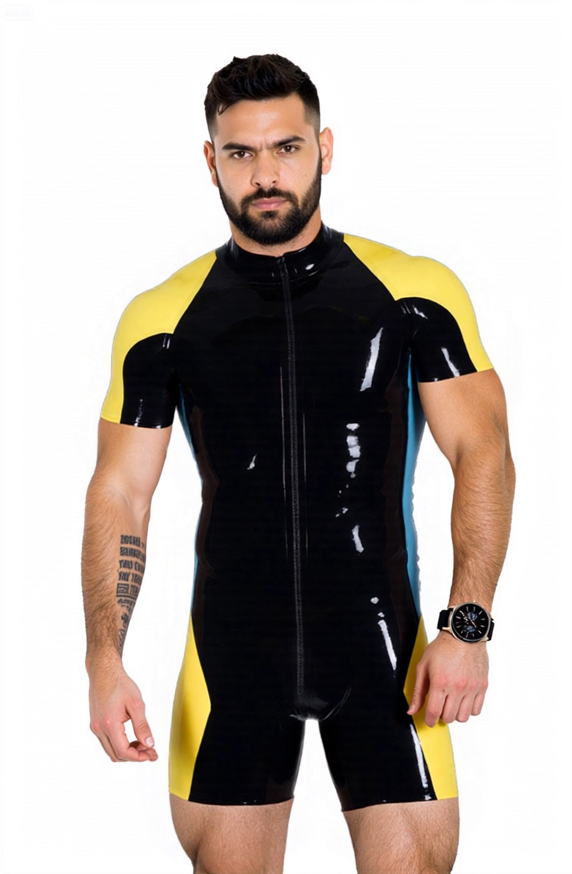 Step into bold confidence with this sleek one-piece bodysuit made of high-shine faux leather. Available in two colorblock styles – classic black with yellow/blue panels, or fierce red with pink accents – this short sleeve design hugs your body like a second skin while amplifying your masculine form.